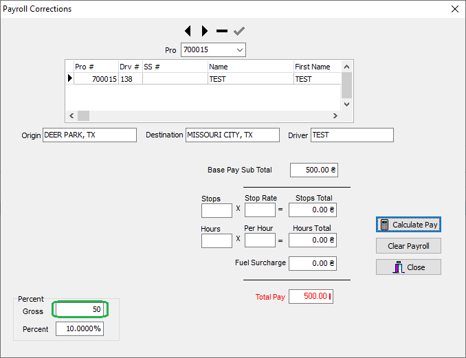 The calculation of the driver's pay depends on the settings in the driver's card, so for the test you just need to fill in the Gross field from