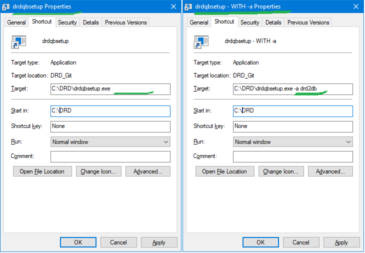 Action: Create 2 shortcuts referring to drdqbsetup.exe In one of them, in the target line, add the -a key and the name of the second database (for example, drd2bd)