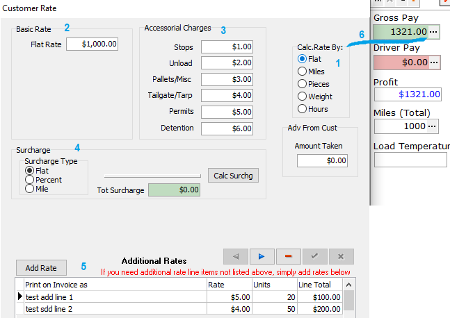 3. Fill in all “Accessorial Charges” fields with different values. This will allow you to see in one save whether all the amounts have been used and if some are not, then determine which one.