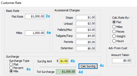 Expectation: “Tot surcharge” (4d) field = “Flat Rate”(2a) multiple “Surchg Amt”(4b) (/100) i.e. it should be $1000