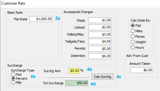 Expectation: “Tot surcharge” field (4d) = “Flat Rate” (2a) multiple “Surchg Amt” (4b) (/100) i.e. it should be $50